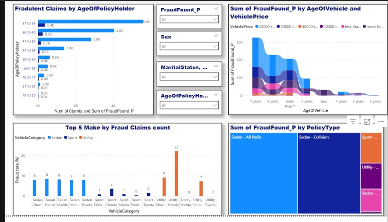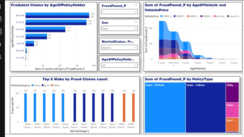 A Power BI dashboard that visualizes patterns in fraudulent insurance claims. It explores relationships between claim frauds, vehicle details, and policyholder demographics.